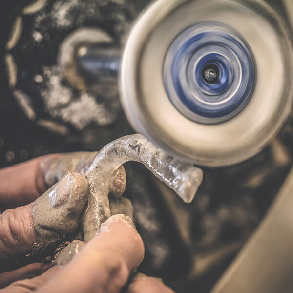 Wir fertigen Schienen aus einem industriell hergestellten Hochleistungskunststoff an. Um Ihrem Kiefer wieder den „richtigen Biss“ zu ermöglichen.